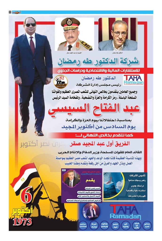 يتقدم الدكتور / طه رمضان رئيس مجلس الإدارة وجميع العاملين بخالص التهاني لفخامة الرئيس عبد الفتاح السيسي بمناسبة احتفالاتنا بالذكري ال ٥٢ لانتصارات أكتوبر المجيدة.