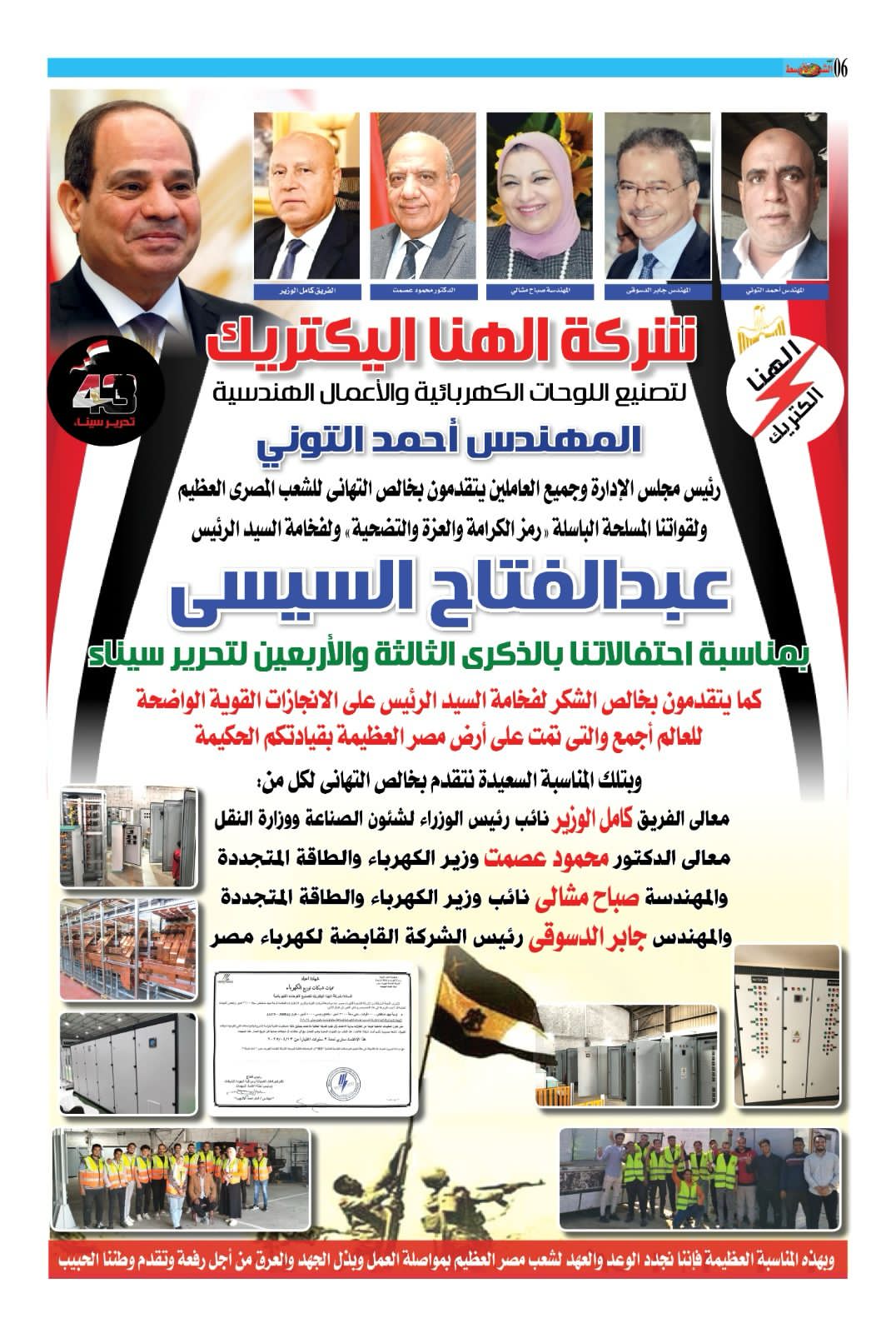من جانبه هنأ المهندس أحمد التوني رئيس مجلس إدارة شركة الهنا إليكتريك لتصنيع اللوحات الكهربائية والأعمال الهندسية، الرئيس عبد الفتاح السيسي بمناسبة أعياد تحرير سيناء، مؤكدا أن الرئيس نجح في تحرير مصر بالكامل لتعود وتقف قوية وتصبح صاحبة الكلمة العليا في الشرق الأوسط، بل باتت مصر «الدولة الوحيدة التي مازالت تقف على رجلها في المنطقة»، مشددا على أن الرئيس السيسي حقق إنجازات غير مسبوقة في خلال سنوات بسيطة.
