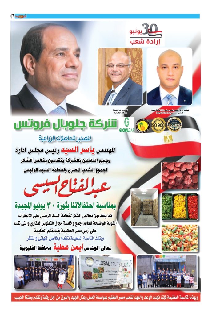 يتقدم المهندس ياسر السيد رئيس مجلس ادإرة شركة جلوبال فروتس لتصدير الحاصلات الزراعية ببرقية تهنئة للرئيس عبد الفتاح السيسى رئيس الجمهورية بمناسبة قرب احتفالاتنا بالذكرى 12 لثورة 30 يونيو المجيدة جاء فيها: “يسعدني ويشرفني بالأصالة عن نفسي أن أبعث لسيادتكم بخالص التهاني بمناسبة ذكرى ثورة 30 يونيو المجيدة ، أعادها الله على سيادتكم وعلى مصرنا الغالية وشعبها العريق بالرفعة والتقدم والرقي ، راجيا الله عز وجل أن يمدكم بموفور الصحة والسعادة والتوفيق ويسدد على طريق الخير خطاكم وكل عام وسيادتكم بخير”.