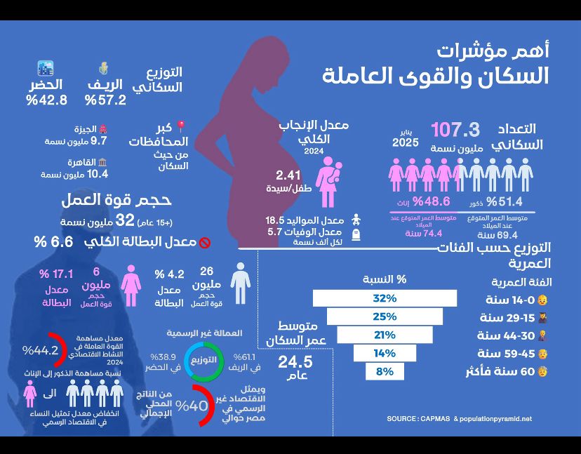 تشير المؤشرات السكانية إلى وجود قاعدة عملاء ضخمة يمكن الوصول إليها بمنتجات تأمينية مخصصة. إذ يبلغ عدد سكان مصر نحو 107.3 مليون نسمة، ويشكل الشباب الذين تقل أعمارهم عن 45 عامًا حوالي 78% من إجمالي السكان، مما يعزز الحاجة إلى تطوير برامج ادخارية وتأمينية طويلة الأجل تناسب هذه الفئة.