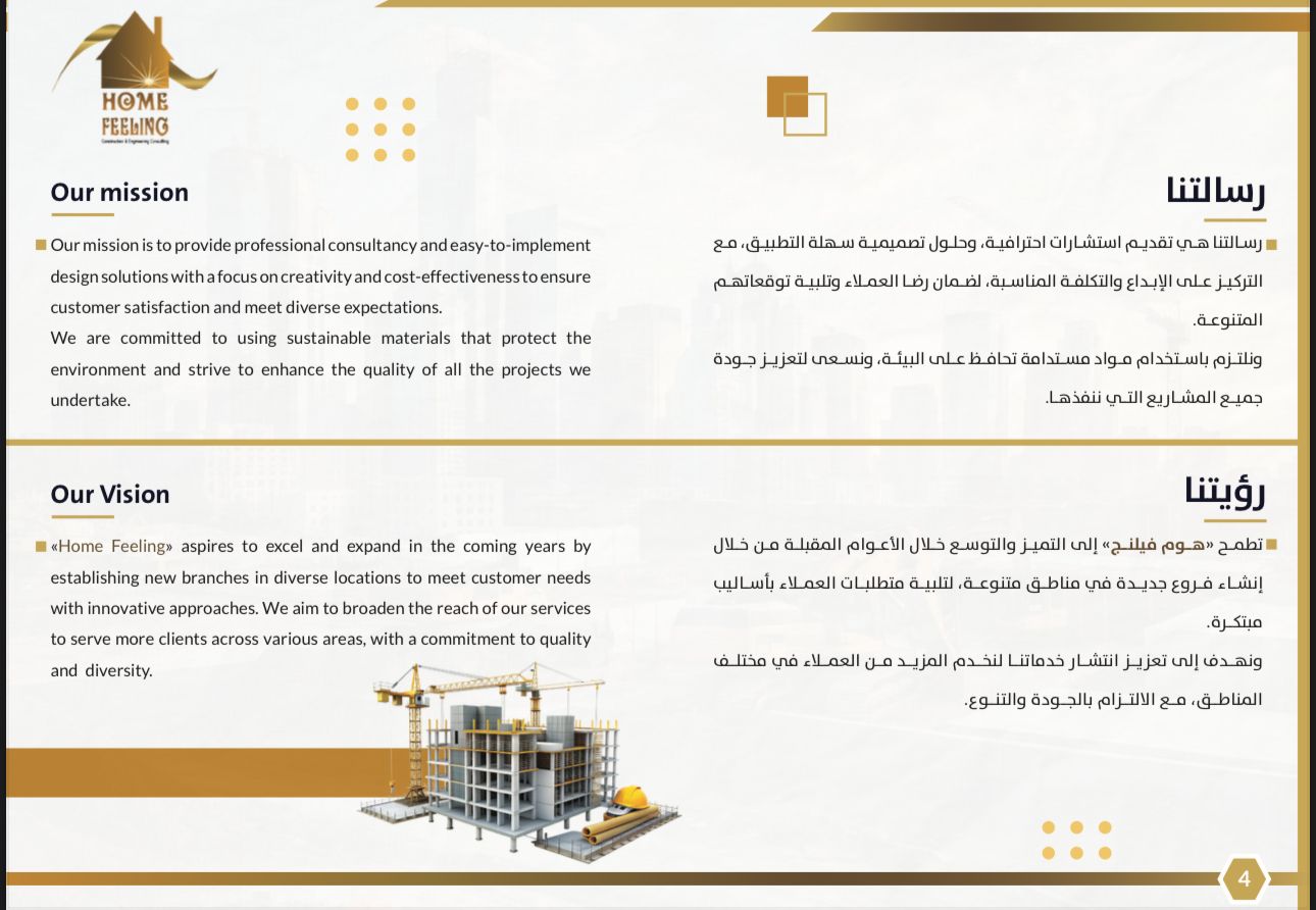 وعن اختيار اسم الشركة قال إن «هوم فيلنج» تعني الشعور بالبيت، ضمن اتجاه كان من المفترض أن تتخصص الشركة فيه وهو التصميمات، لكن عشقه للمقاولات جعله يتجه للعمل فيه، بينما إطلاق الاسم في البداية كان يعطي انطباعا للعميل بأننا نشعر به في منزله ونعمل على حل أي مشكلة قد يواجهها لأن دور المهندس هو إيجاد حلول للمشاكل في أي دور يتواجد فيه.