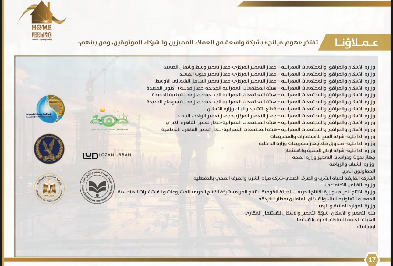 وأوضح أن الشركة تعاونت أيضا مع وزارة الإسكان والمجتمعات العمرانية، ودشنت عمارات إسكان اجتماعي، منها سبع عمارات في مدينة 6 أكتوبر حاليا، و10 عمارات في سوهاج و9 في أسوان الجديدة وغيرها من المشروعات، كما عملت مع عدد من الشركات الكبيرة من القطاع الخاص ومنها شركة هابي لاند في العبور، مضيفا أن الشركة تخصصت أيضا في مشروعات المياه والصرف الصحي وتعاونت مع شركة الدقهلية لمياه الشرب والصرف الصحي.